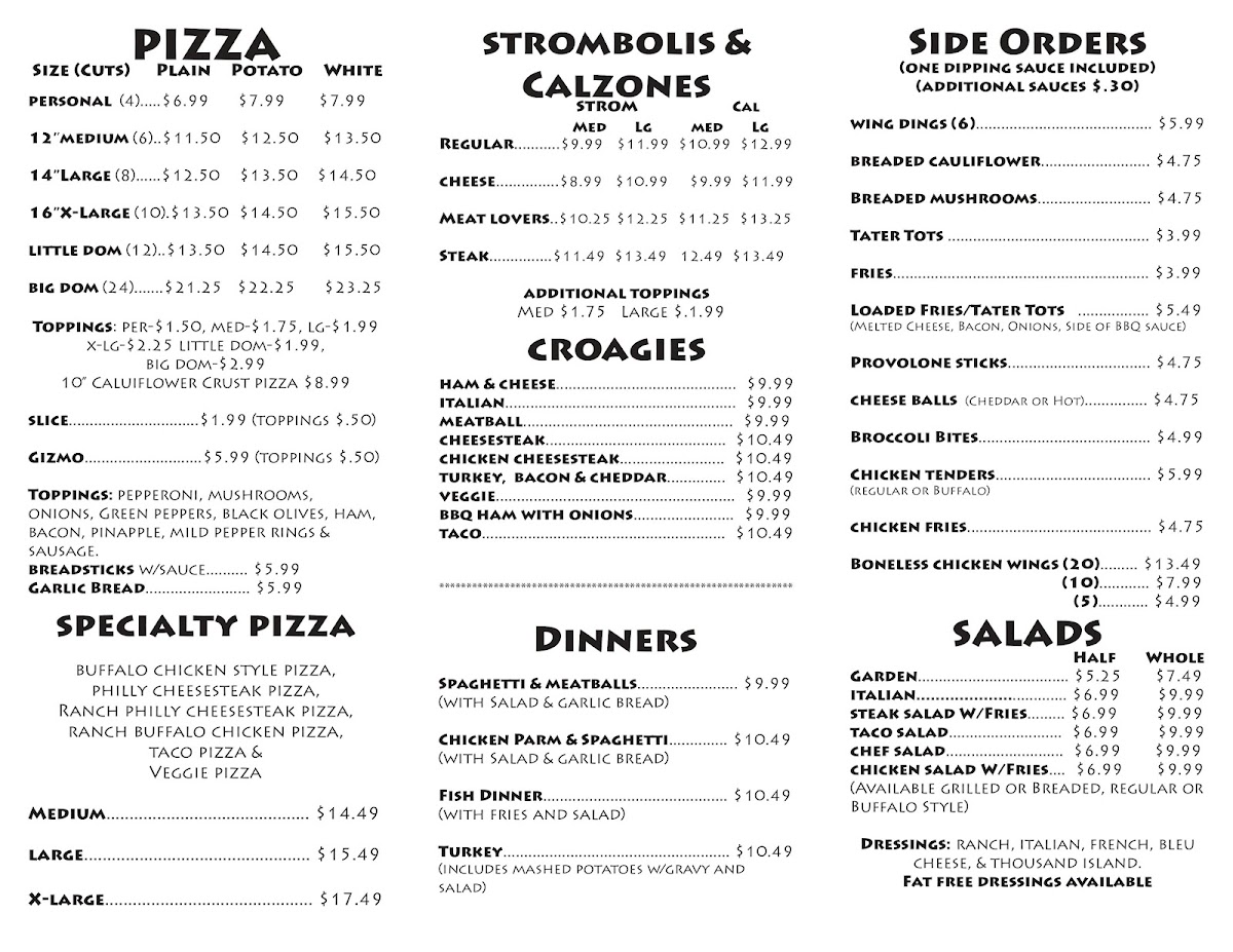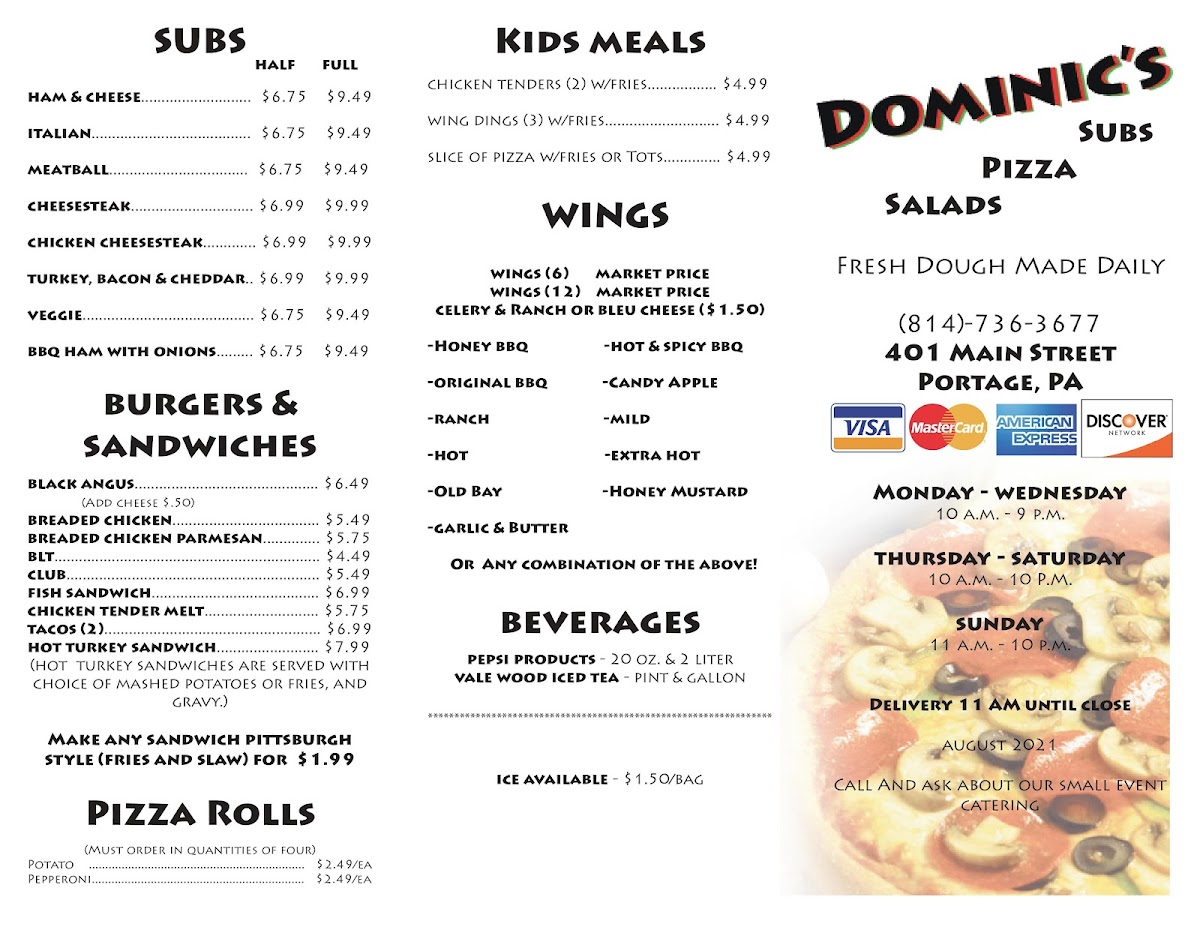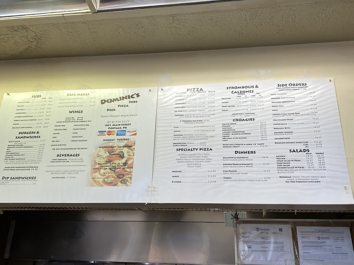 Tucked along 401 Main Street in Portage, Dominic's Family Pizza Menu brings the comforting flavors of a true small-town pizzeria to life. Every dish here feels like a warm invitation to gather around the table - whether it’s a classic pepperoni pie, a hearty meat lover’s favorite, or a veggie-loaded slice that bursts with freshness. The menu balances traditional recipes with a few creative twists, making it easy for everyone to find something they love. Beyond the pizza, guests can dive into subs stacked with flavor, baked pasta dishes bubbling with cheese, and appetizers perfect for sharing. It’s the kind of place where the aroma of melted mozzarella and toasted crust greets you before you even walk in, and every bite feels like a nod to family dinners done right.